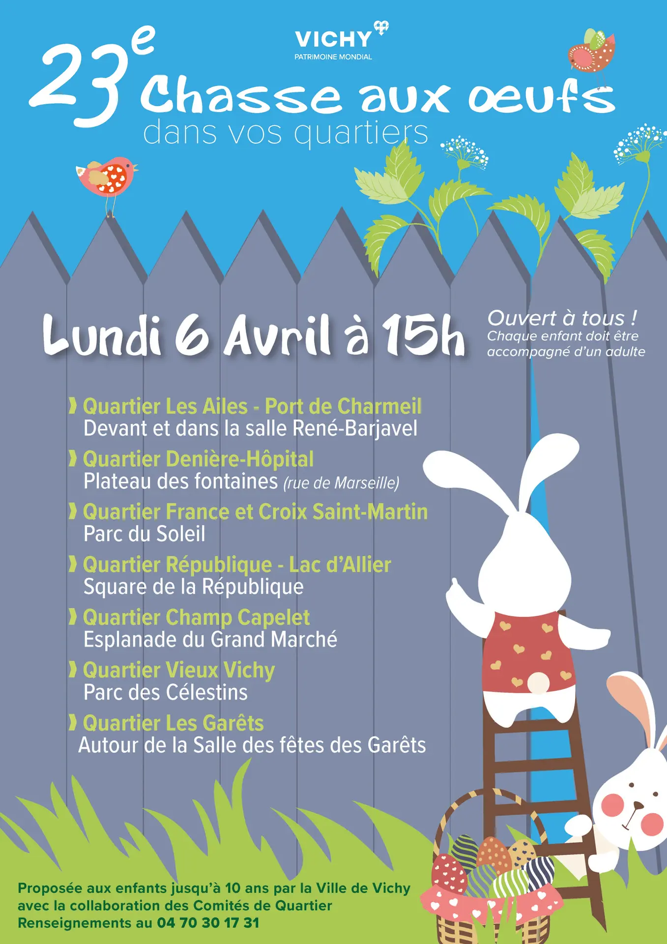 La Ville de vichy propose une chasse aux œufs destinée aux enfants jusqu'à 10 ans, organisée avec les comités de quartier.