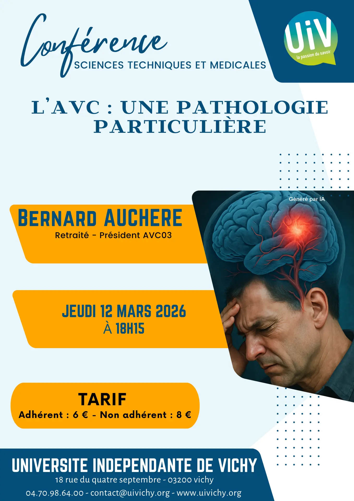 L’Accident Vasculaire Cérébral (AVC) et son déclenchement brutal, obéit à des scenarii commandés par le cerveau tous différents les uns des autres. A partir de la présentation de la pathologie, ses particularismes seront abordés en utilisant toutes les expériences vécues par les membres de l’association AVC03.