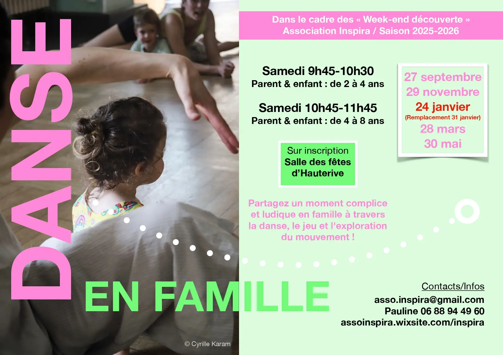 L'atelier "Danse en famille" est un moment dans lequel vous allez, découvrir, ressentir, entrer dans le toucher et voyager avec votre imaginaire à partir de propositions guidées. Cela peut s'apparenter à une forme d'expression corporelle.