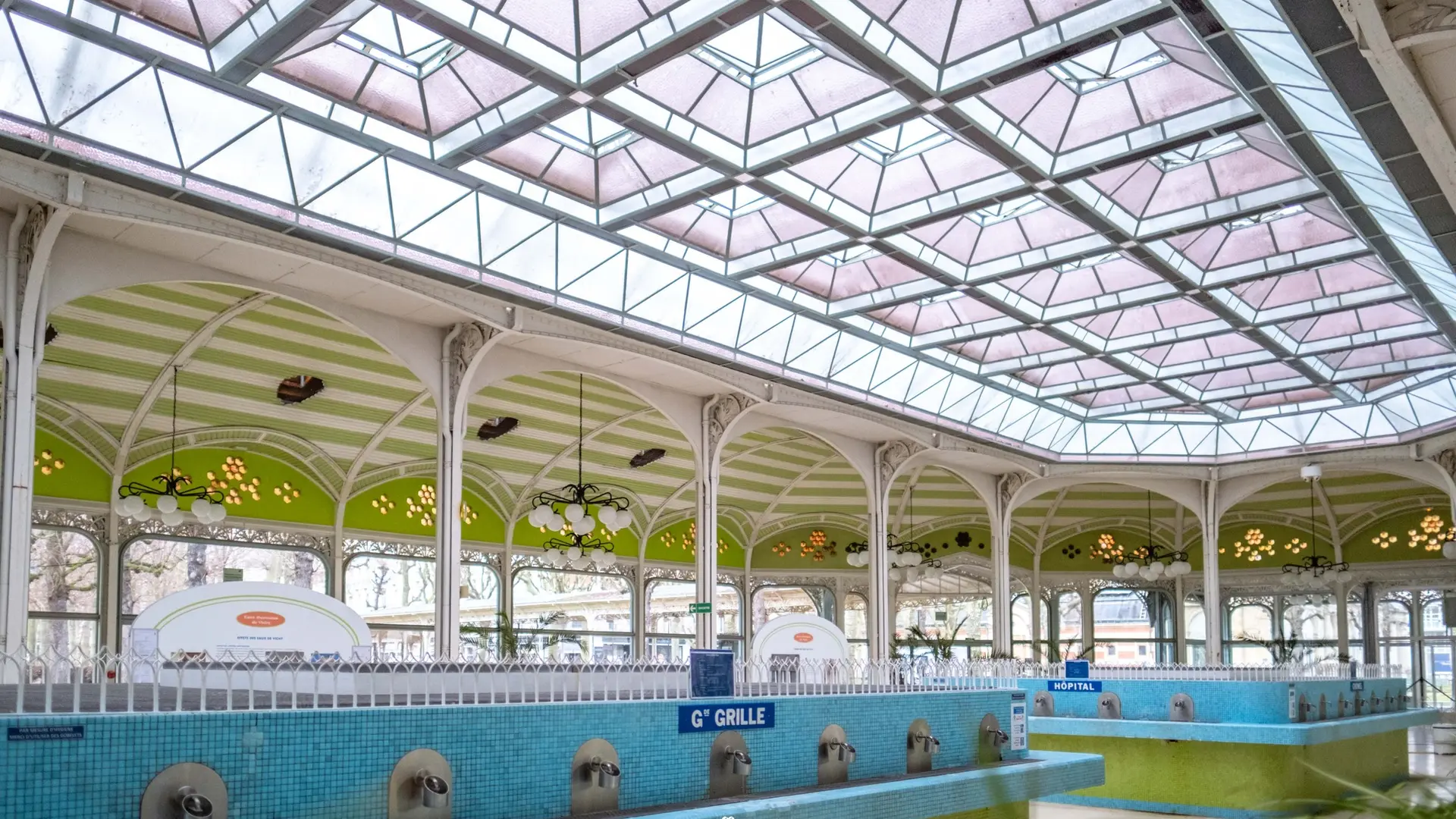 En 1928, le hall connaît d’importantes transformations : les grilles du pourtour sont remplacées par des vitres afin de protéger les curistes des courants d’air ; l’espace central est dégagé grâce à la suppression des gargarisoirs, et la verrière zénithale est surélevée et munie de carreaux en pointes de diamant afin de limiter l’effet de serre. Une nouvelle campagne de modernisation entraînera la suppression des buvettes d’origine, et des donneuses d’eau, au début des années 1970.