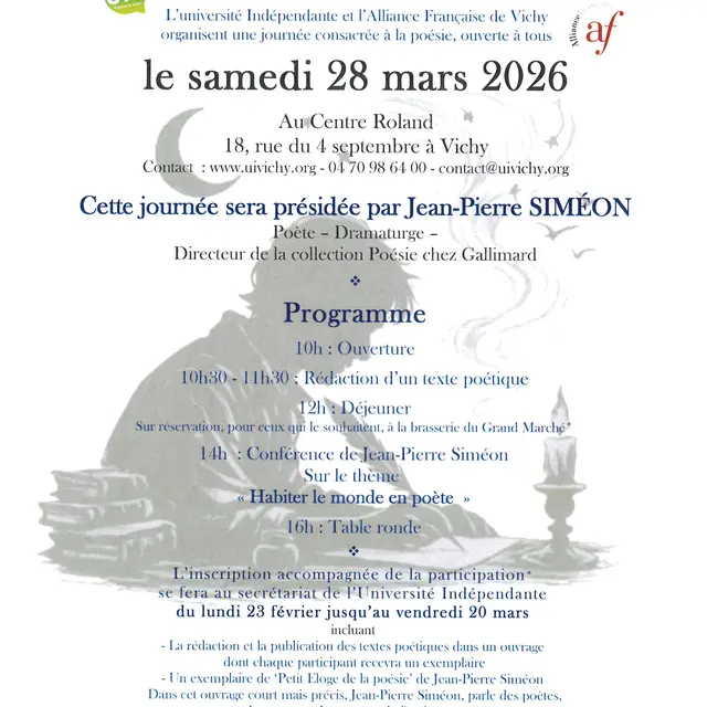 Journée de la poésie organisée par L'Université Indépendante de Vichy et l'Alliance Française et présidée par Jean-Pierre Siméon, poète, dramaturge, Directeur de la collection Poésie chez Gallimard.