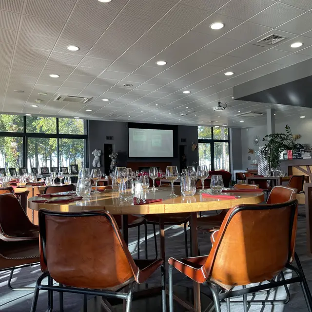 Salle spacieuse et grande terrasse avec vue sur le parcours de golf.