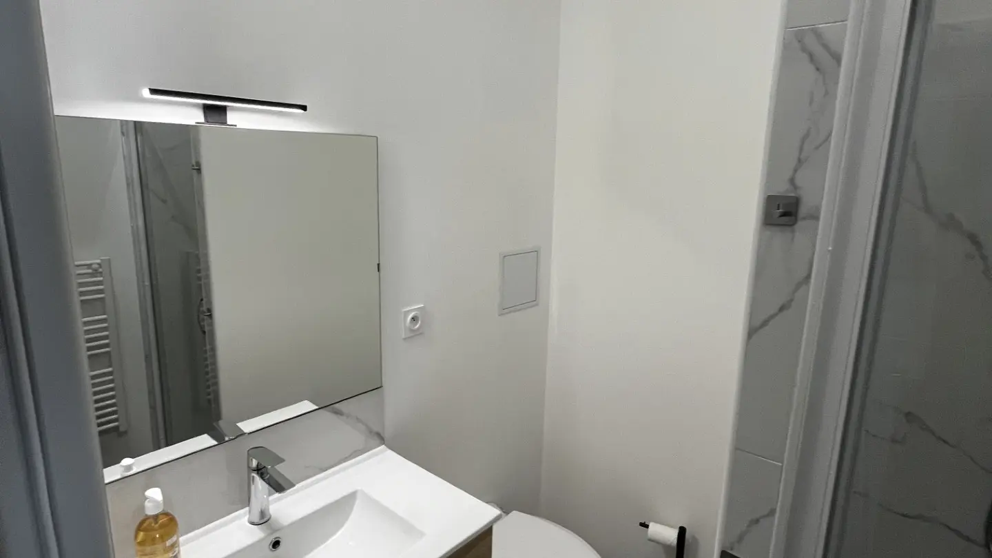 • Une salle de bain moderne et spacieuse, effet marbre, avec douche et WC suspendu.
