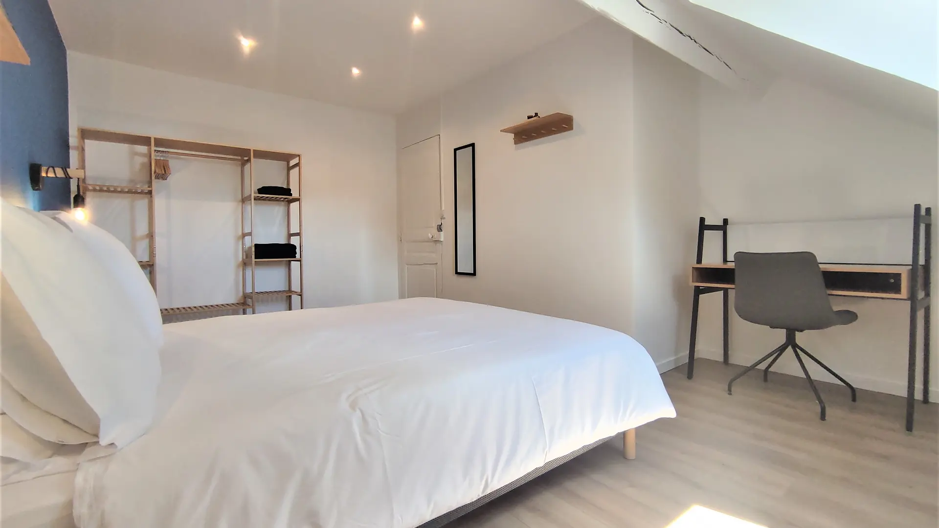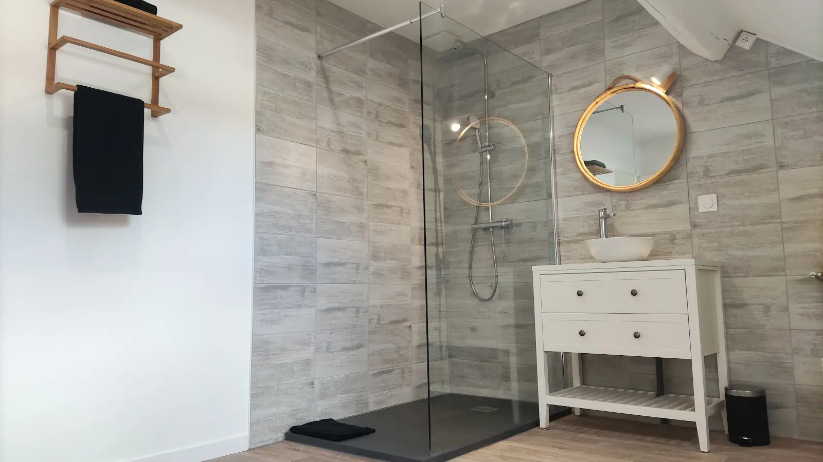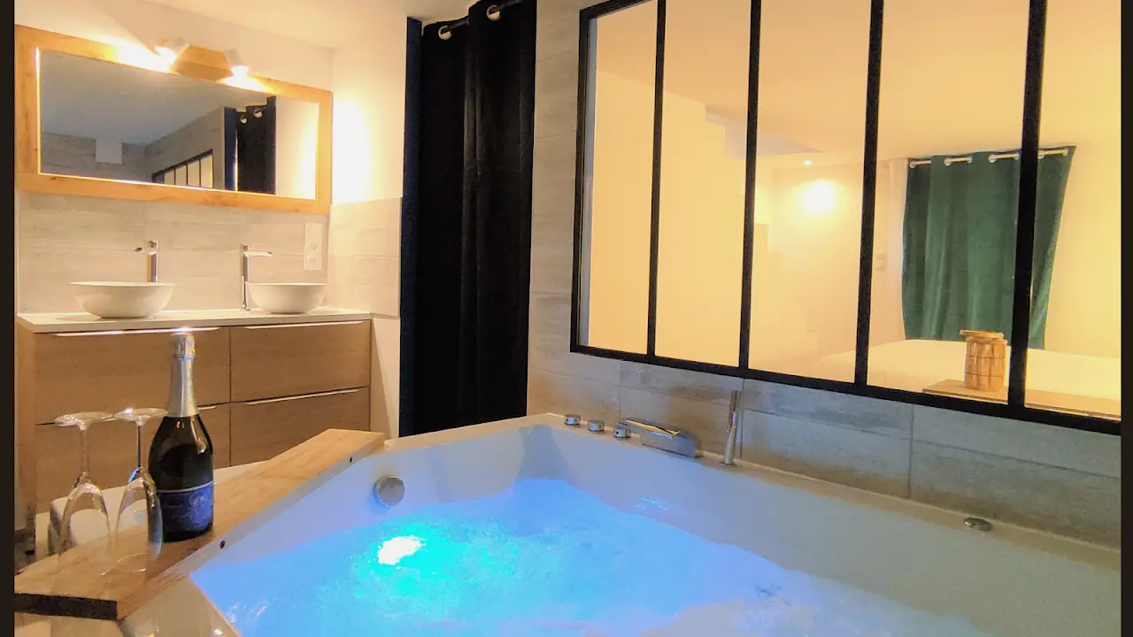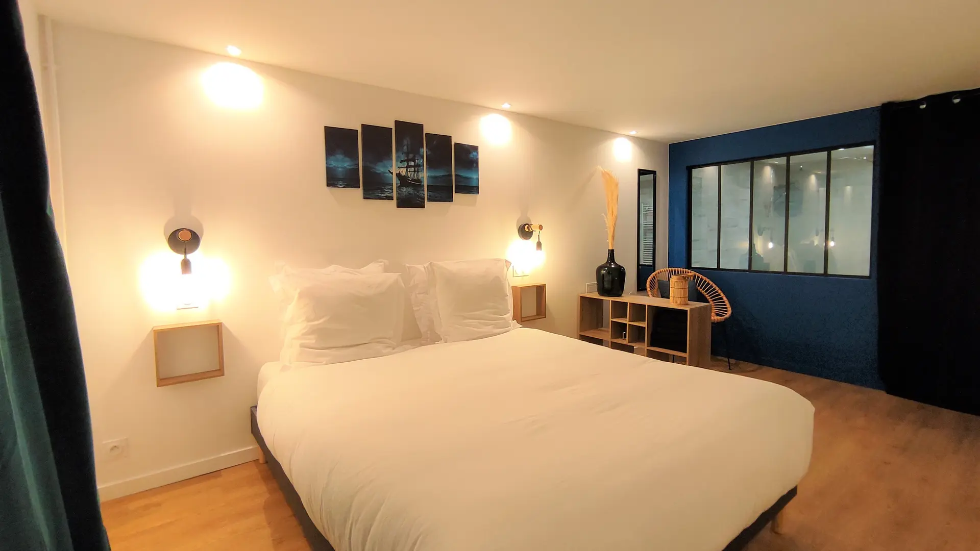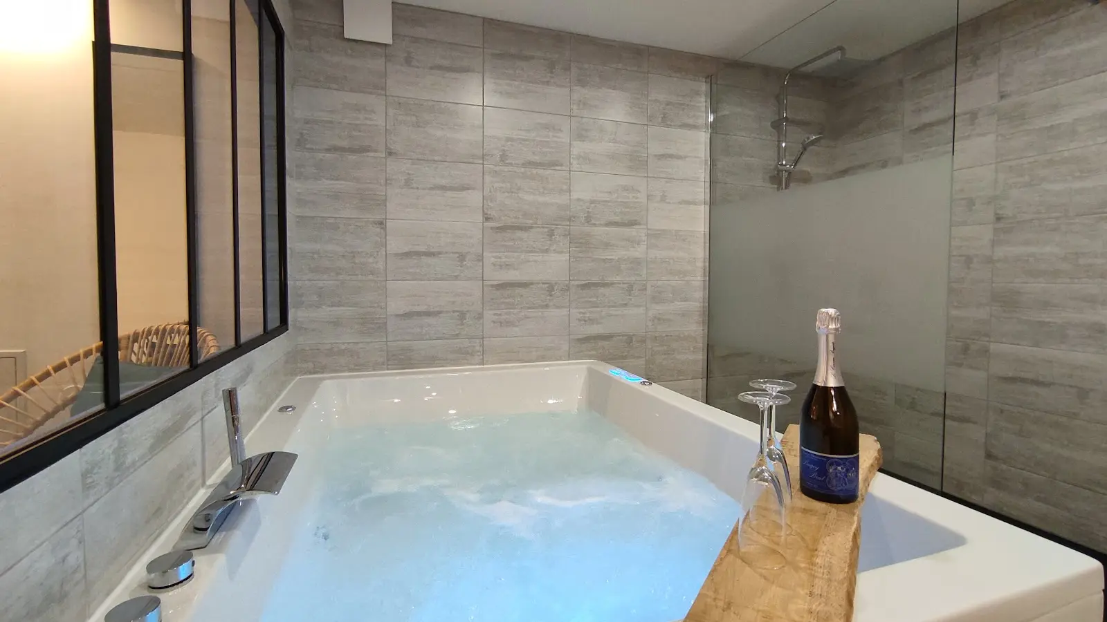 Un premier espace composé d’une suite comprenant un lit queen size (160x200cm) qui s'ouvre sur une grande salle de bain équipée de la baignoire SPA balnéo pour 2 personnes, d'une douche spacieuse (90x140cm) et d'un WC.